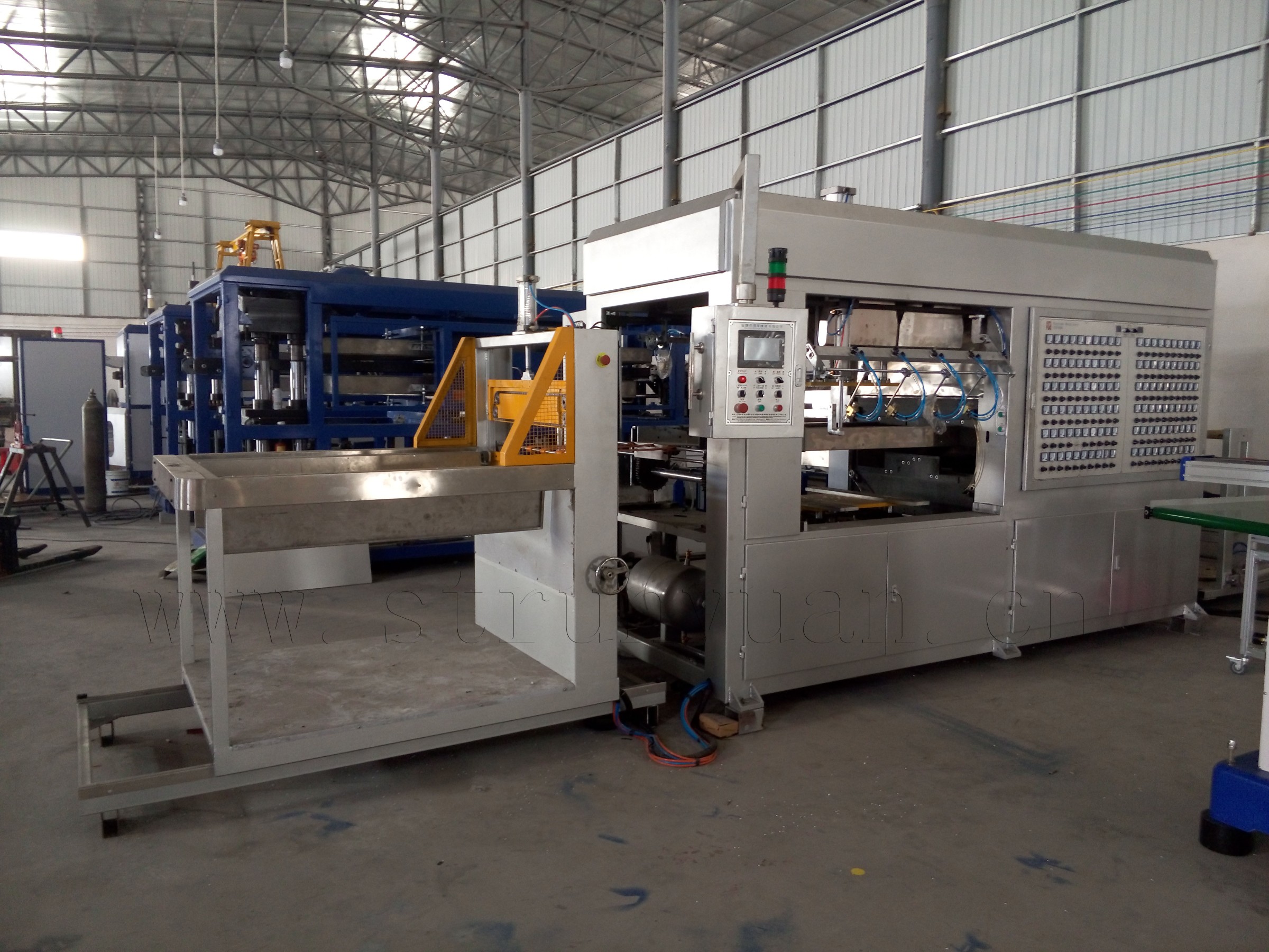 The machine is combined with pneumatic, mechanical and drive to achieve automatic continuous working of feeding sheet, forming, demoulding, ection cutting and stacking. Using PLC control system makes the machine working more reliable.