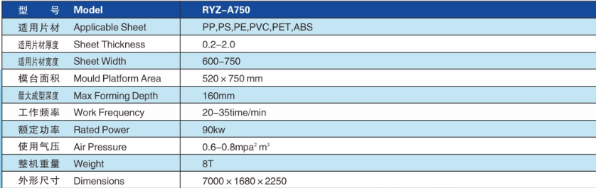 RYZ-750系列全自動液壓制杯機是我司開發(fā)研制的高速度,高效率的全自動塑料容器的成型機。該機適用于生產PS,PP,PVC,PET,ABS等塑料片材